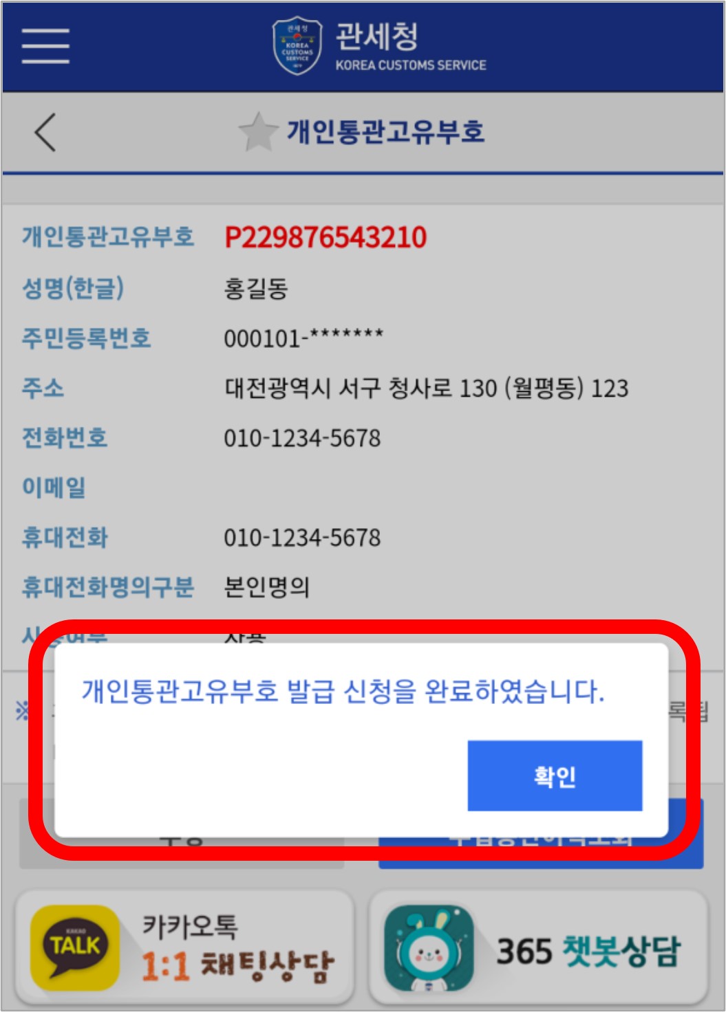 개인통관고유부호 발급이 완료되었습니다. 화면에 표기되는 빨간색 부호가 본인의 개인통관고유부호입니다.