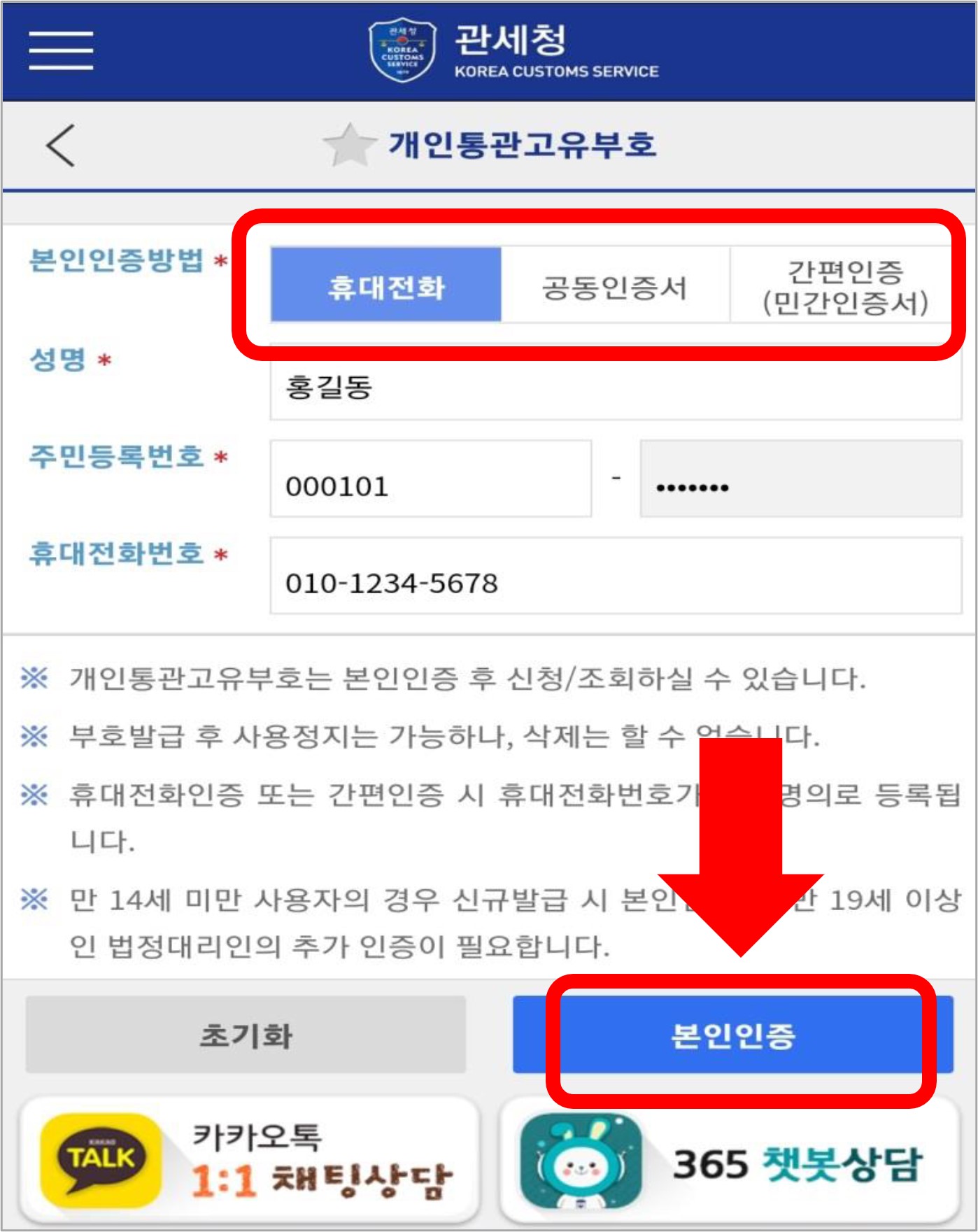 3. 본인인증(휴대폰, 간편인증, 공동인증서 등)