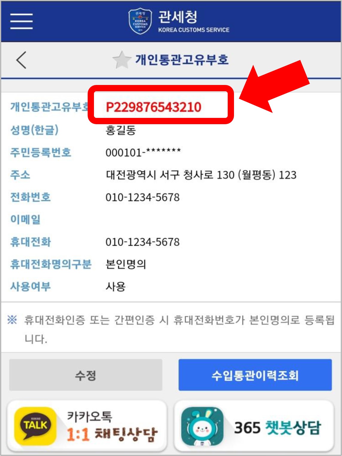 개인통관고유부호는 주민등록번호만큼이나 중요한 개인정보입니다. 절대 타인에게 빌려주거나, 외부로 유출되지 않도록 주의하시기 바랍니다.