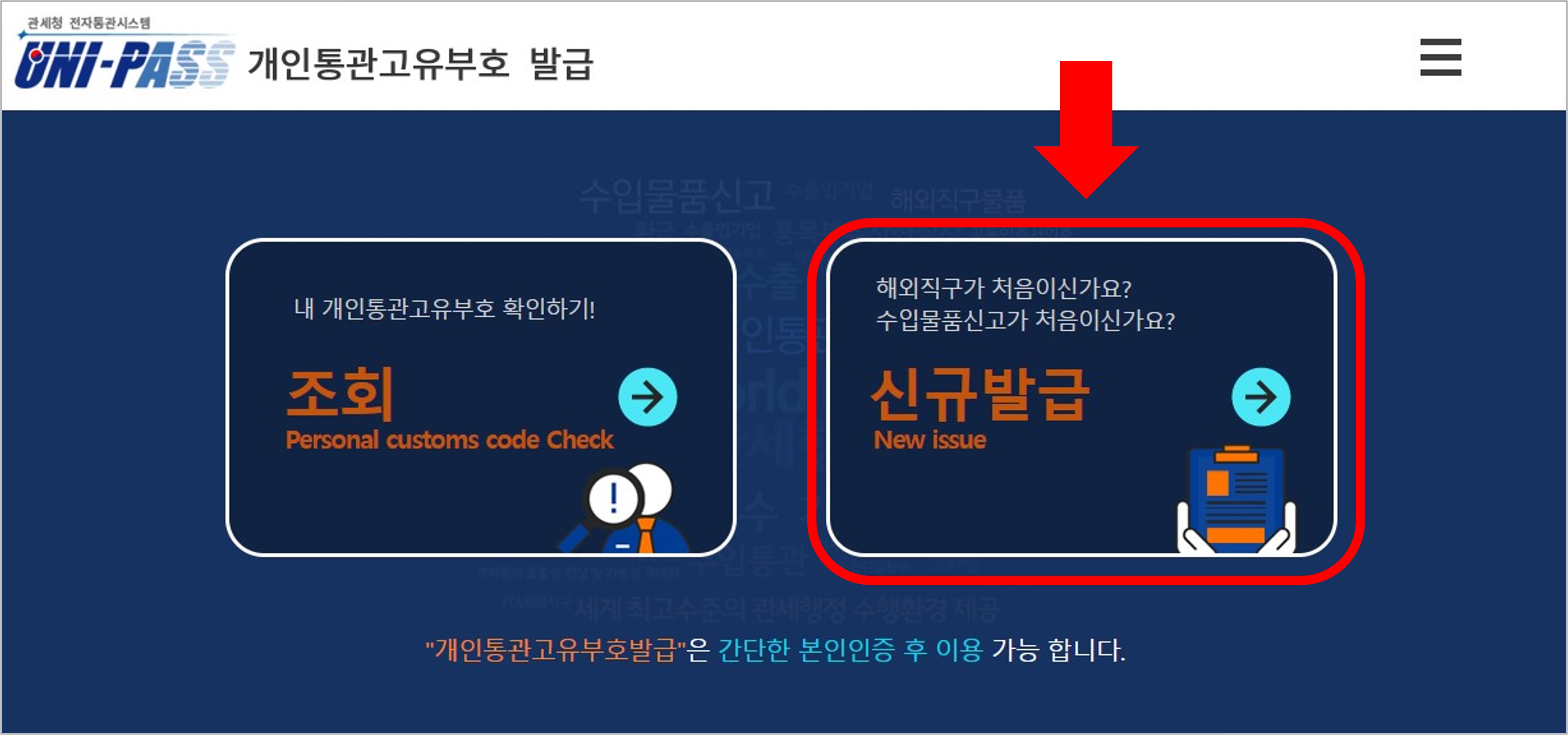 관세청 웹사이트에서는 신규발급 버튼을 클릭합니다.