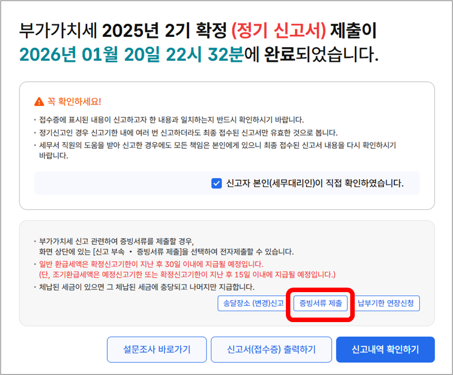 - 혹시 창을 닫았어도 괜찮습니다! 부가세 [증빙서류제출] 란에서 언제든지 서류를 제출하거나 수정할 수 있어요.