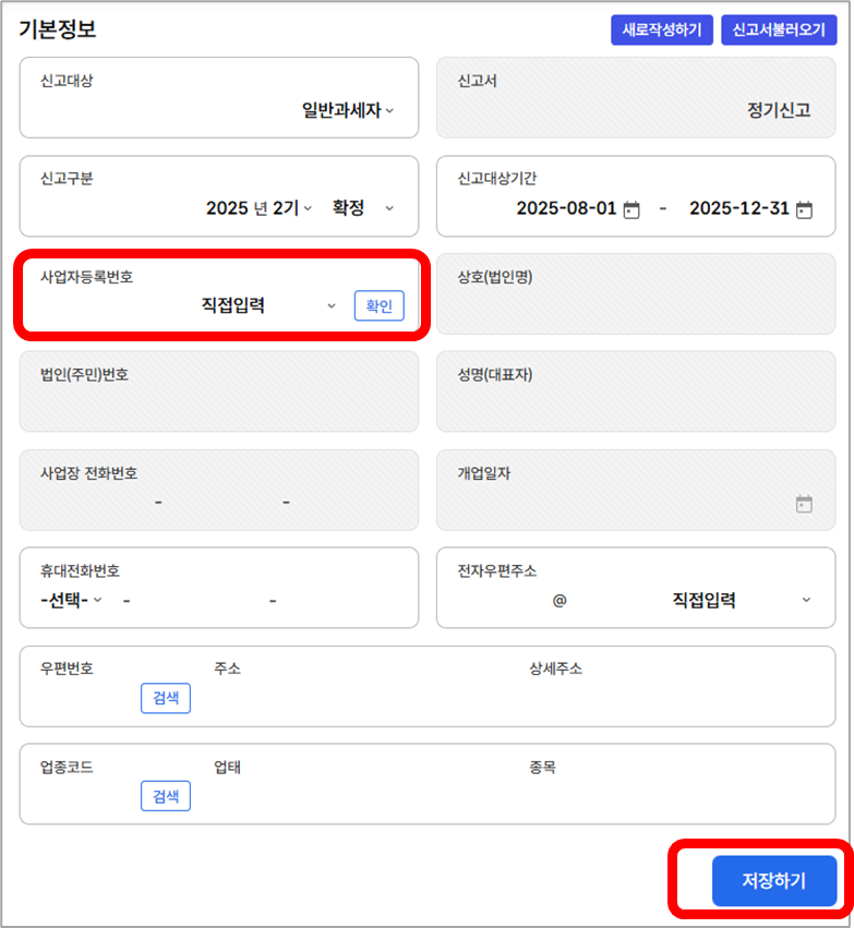 ③ [사업자등록번호] 옆의 [확인]을 누르면 내 정보가 자동으로 뜹니다.