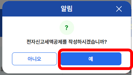 - 이때 "전자신고세액공제를 작성하시겠습니까?"라는 팝업이 뜨는데,