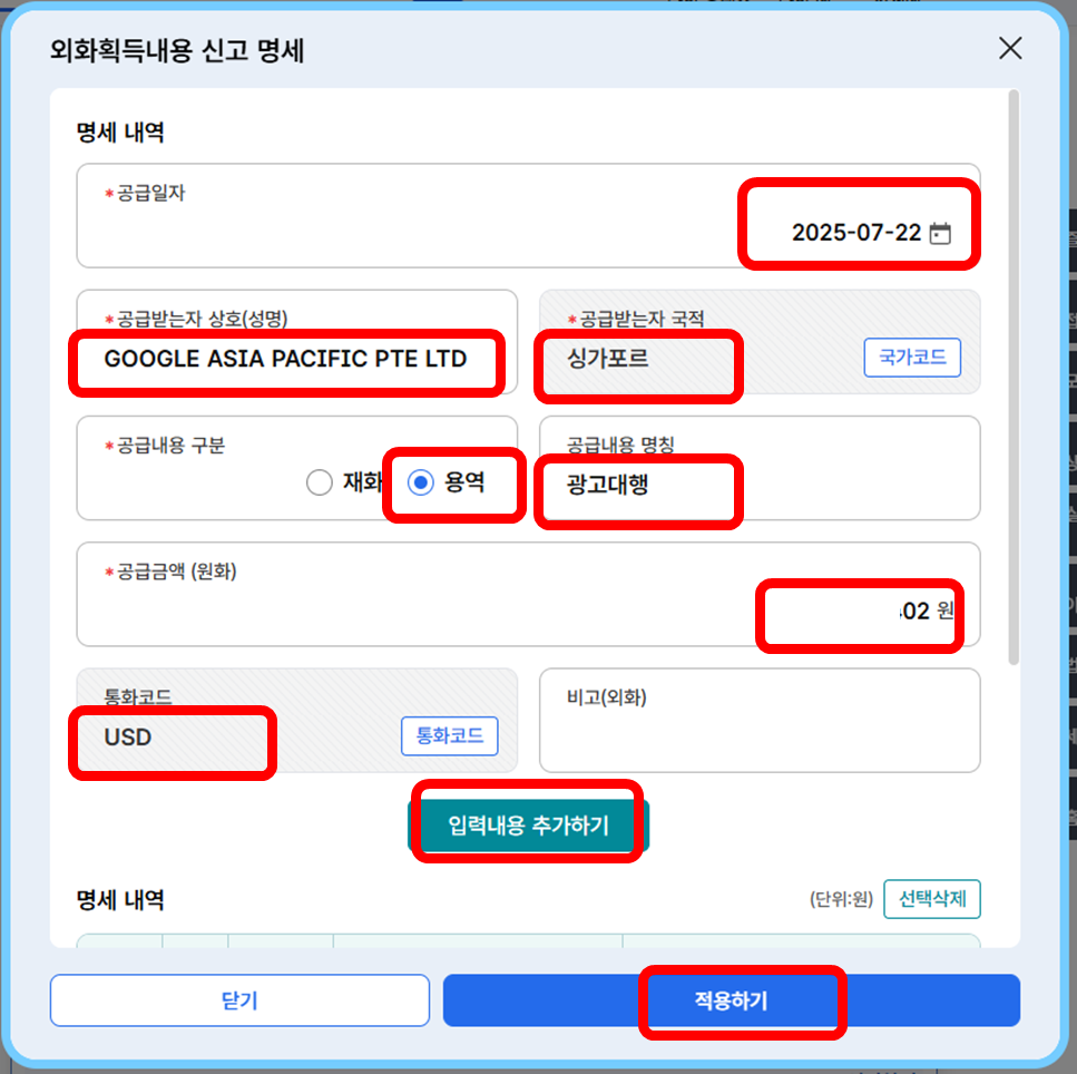 - 공급받는자 상호: Google Asia Pacific Pte. Ltd. (구글 아시아 퍼시픽)
