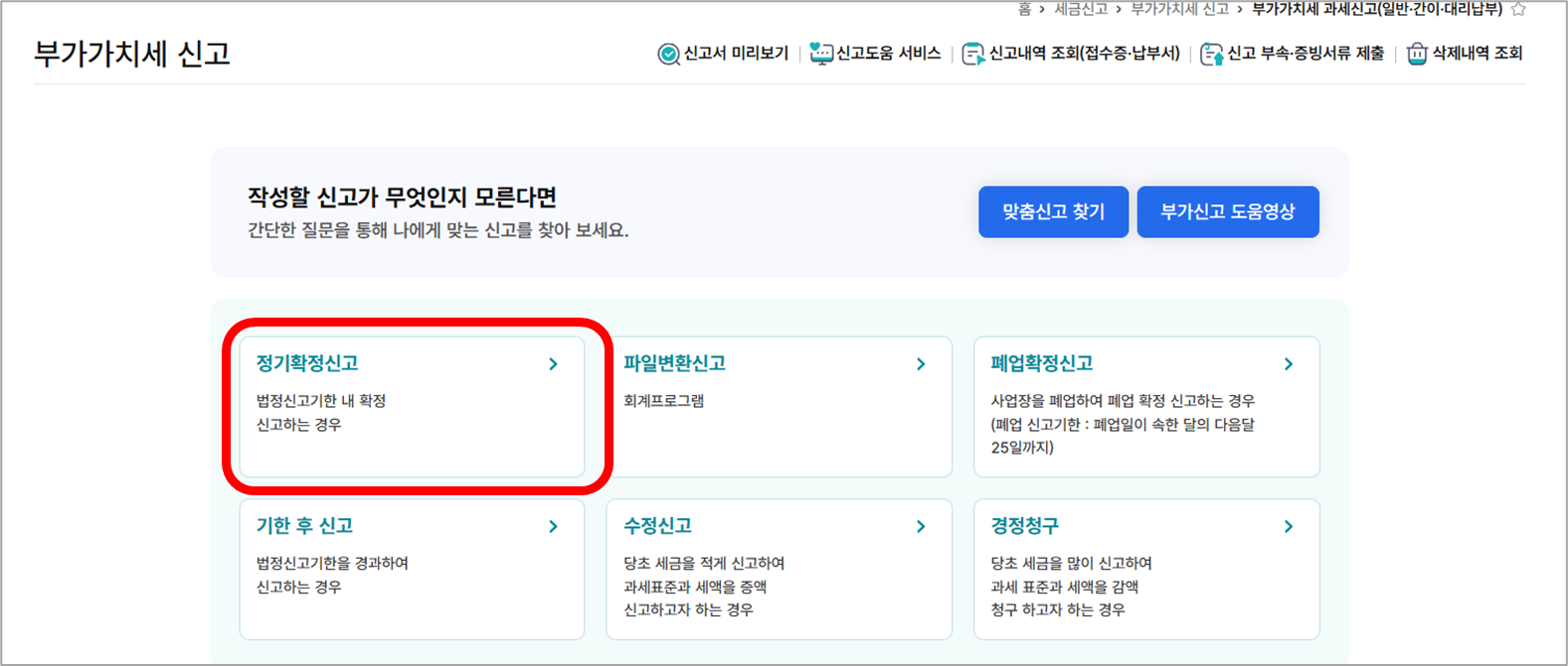② 그 다음 [세금신고] → [부가가치세 신고] → [정기확정신고]를 클릭합니다.