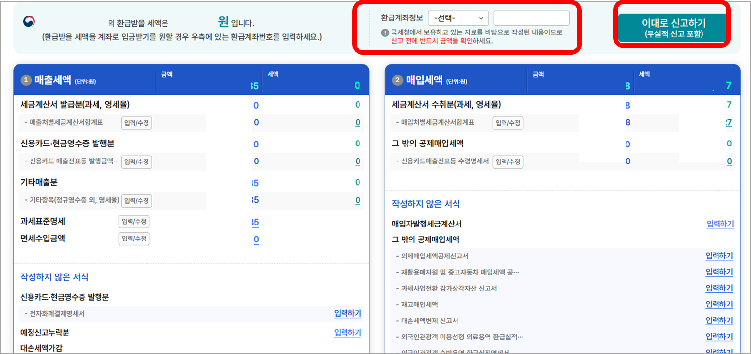 ① 혹시 환급액이 있으면 계좌정보를 입력하고, 없으면 [이대로 신고하기]를 누르면 끝!