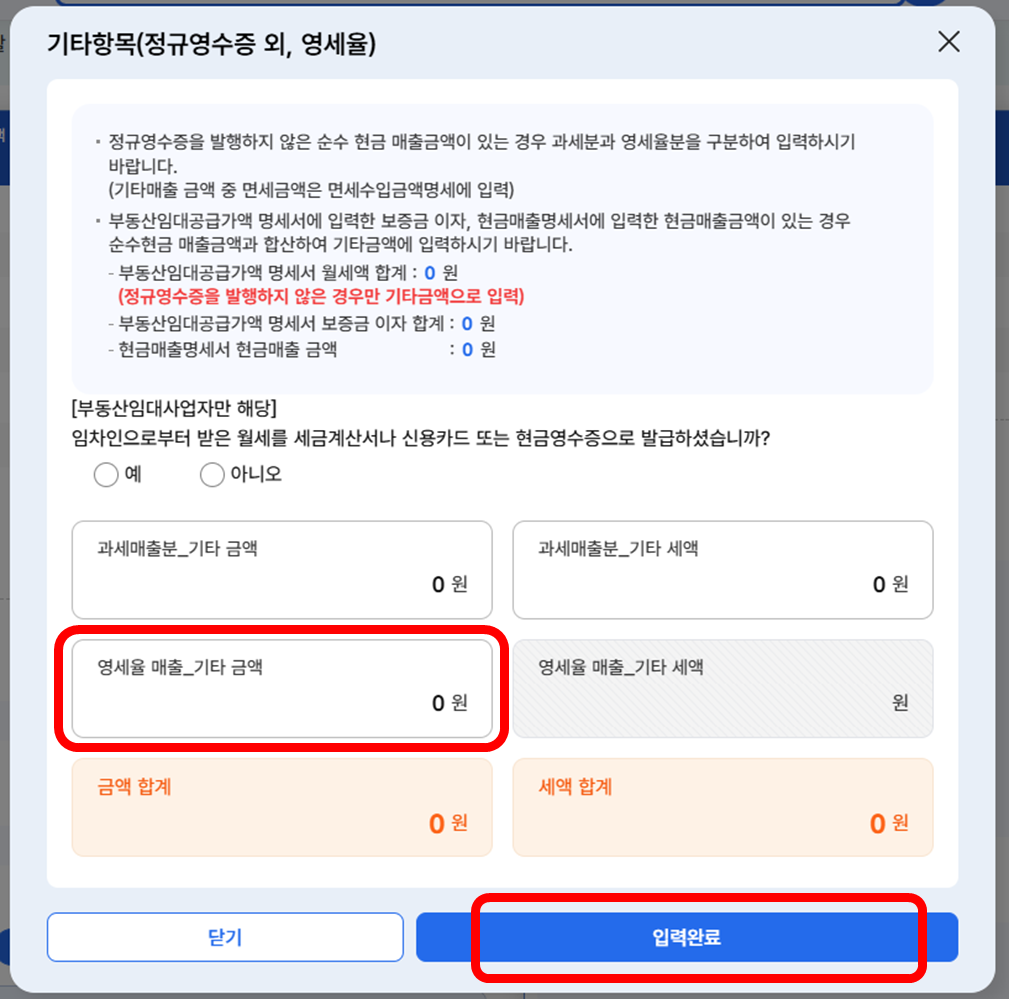 일반 식당이나 카페와 다르게, 우리는 [기타항목(정규영수증 외, 영세율)]에 입력해야 합니다.