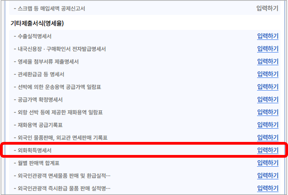 ① [외화획득명세서]의 [입력하기]를 클릭합니다.