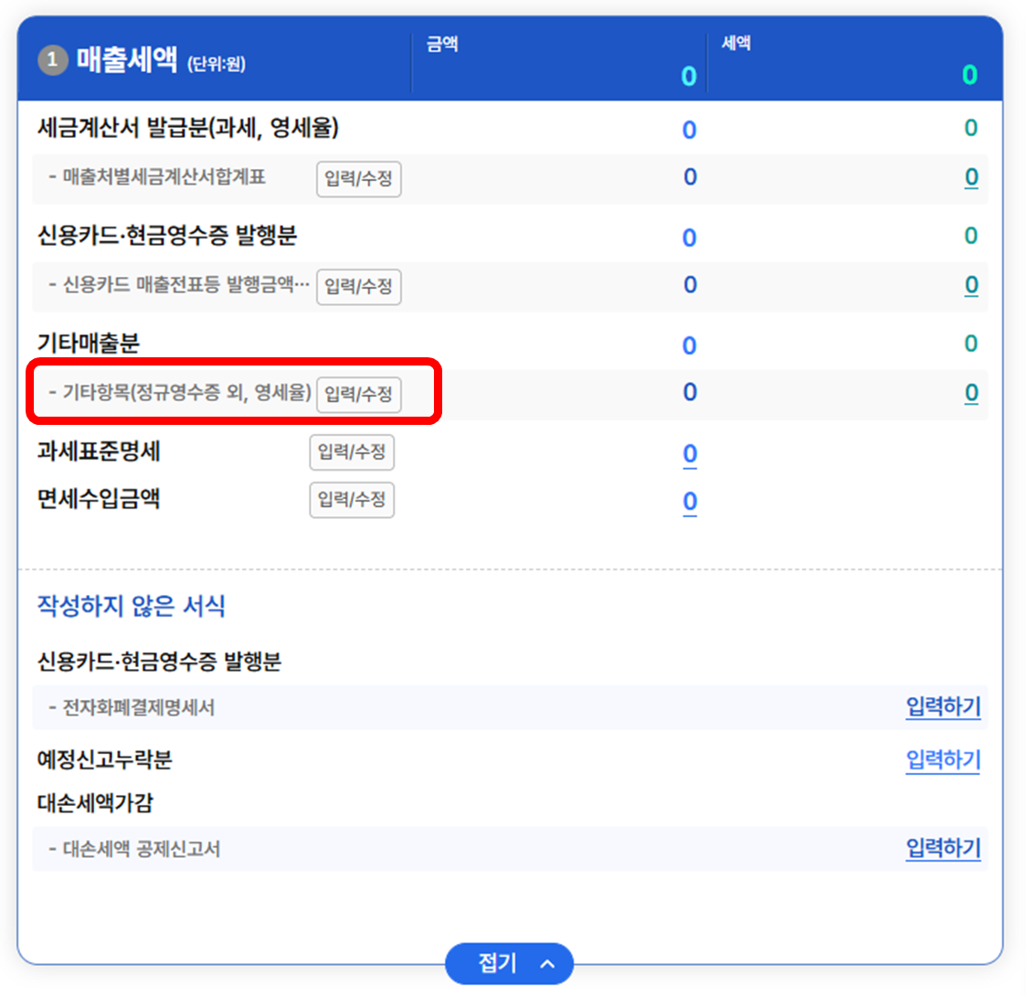 ① [매출세액] 항목 중 [기타항목(정규영수증 외, 영세율)]이라고 적힌 부분의 [입력/수정] 버튼을 누릅니다.