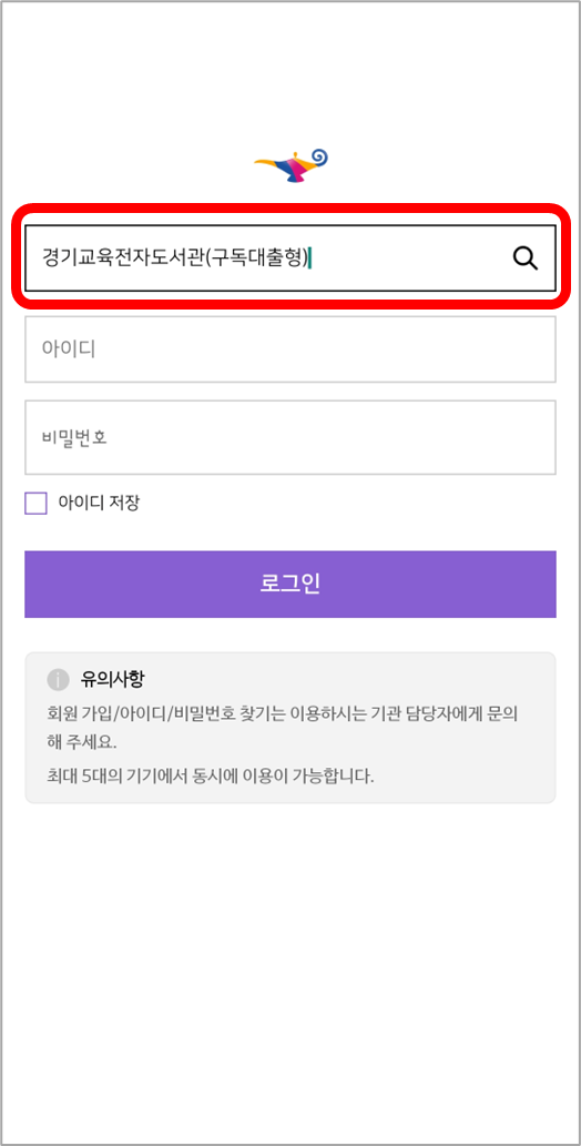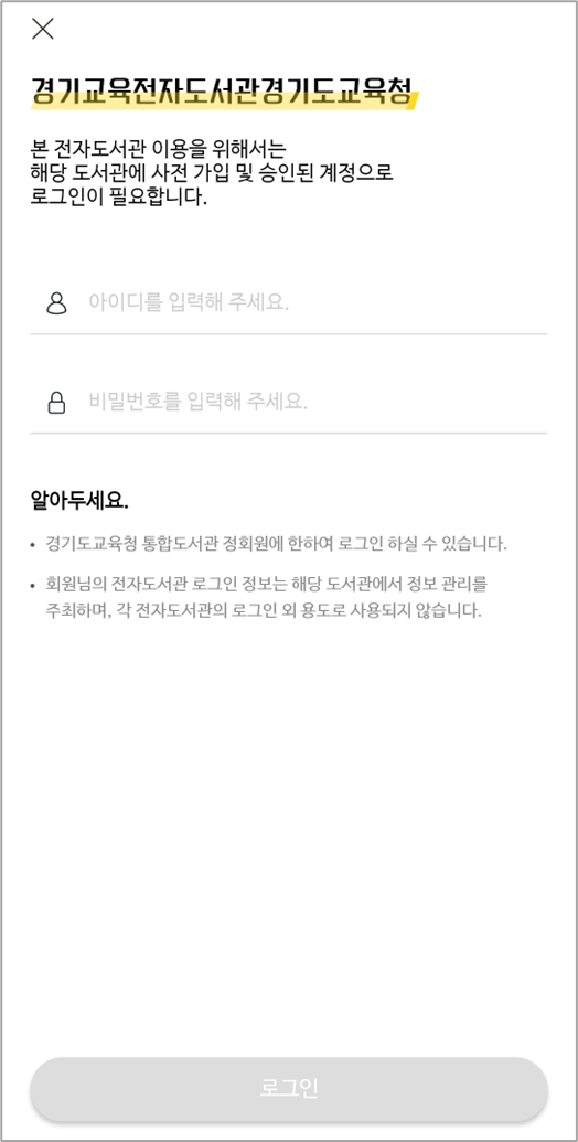 도서관 검색창에서 [경기도교육전자도서관(구독대출형)]을 선택한 후, 경기교육전자도서관의 아이디와 비밀번호로 로그인합니다.
