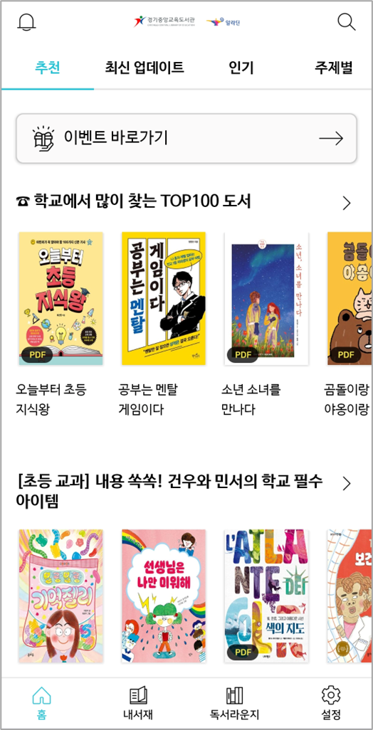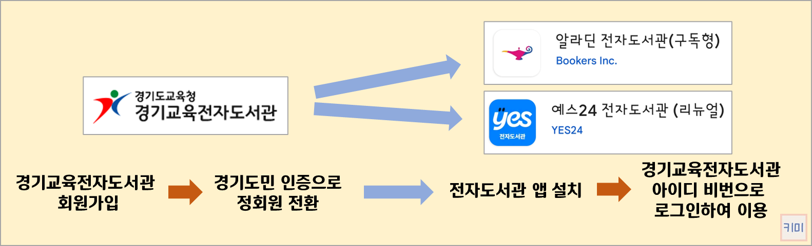 경기교육전자도서관은 일반 전자책과 구독 대출형 전자책 두 가지가 있는데, 구독 대출형 전자책은 알라딘 전자도서관 앱 또는 yes24 전자도서관 앱에서 이용 가능합니다.