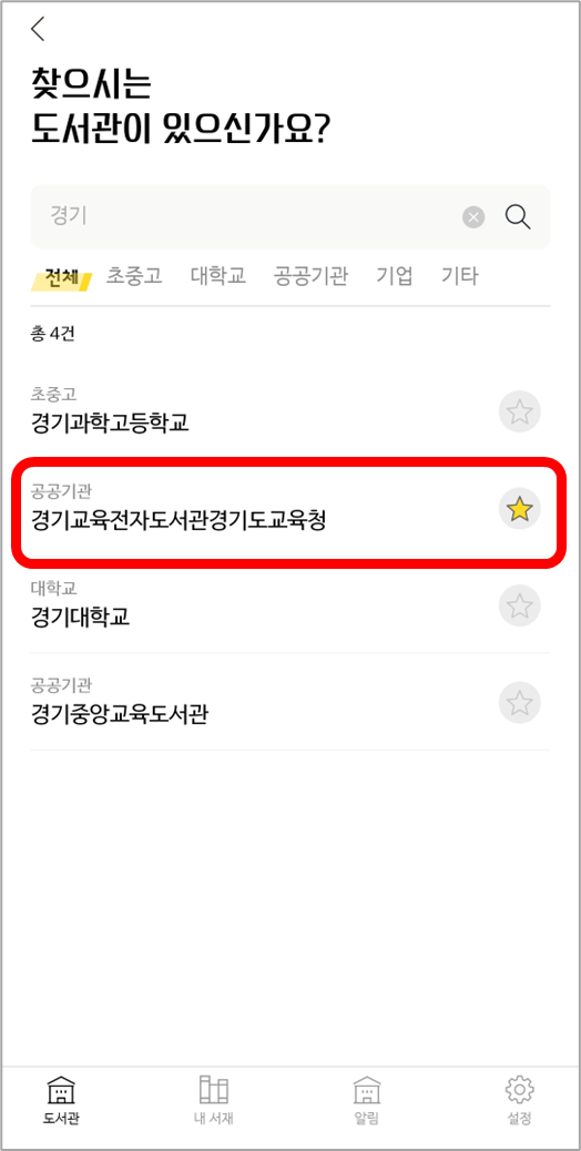 앱을 실행하여 도서관 선택 창에서 [경기교육전자도서관경기도교육청]을 선택합니다.