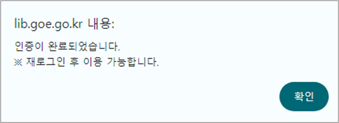 그러면 잠시 후 인증 완료 안내창이 뜹니다. 이제 재로그인 후 다양한 전자책을 무료로 이용할 수 있는 자격이 주어집니다.
