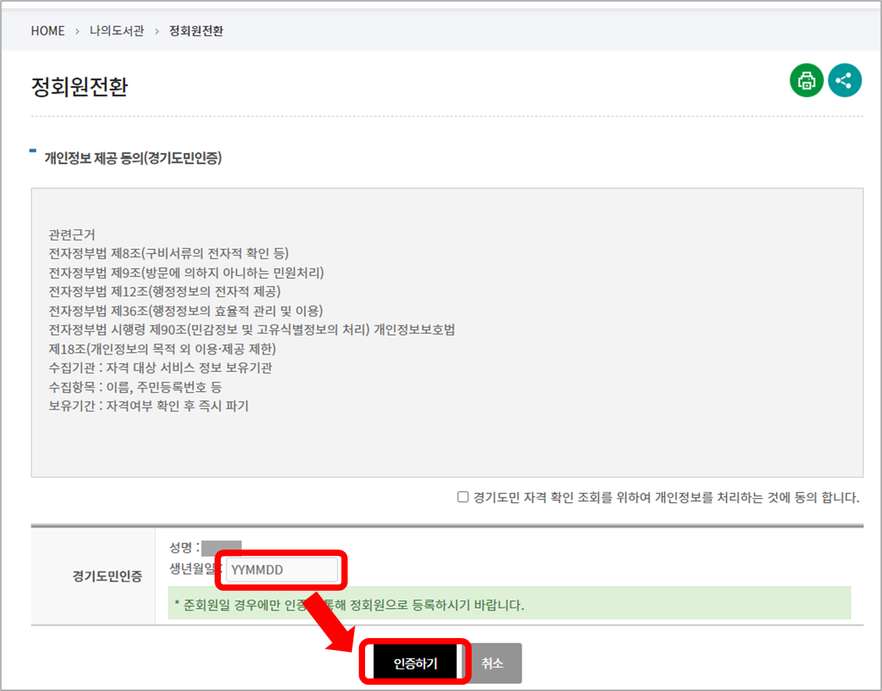 생년월일 6자리를 입력하여 [인증하기]를 클릭합니다.