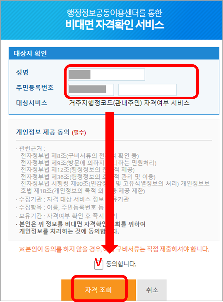 그다음 아래와 같은 팝업창에서 주민번호 뒷자리를 입력하고, 개인정보 제공에 동의합니다.