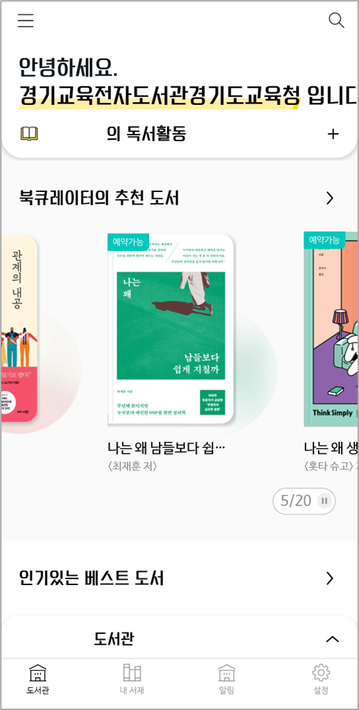 경기교육전자도서관은 알라딘 전자도서관 앱과 yes 전자도서관 앱 두 곳에서 모두 이용 가능합니다. 본인이 편한 앱을 이용하시면 됩니다.