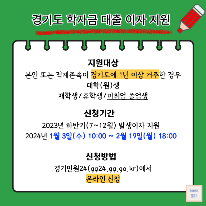 이번 포스팅에서는 경기도 학자금대출 이자 지원 사업의 신청기간 및 신청방법에 대해 알아보겠습니다.