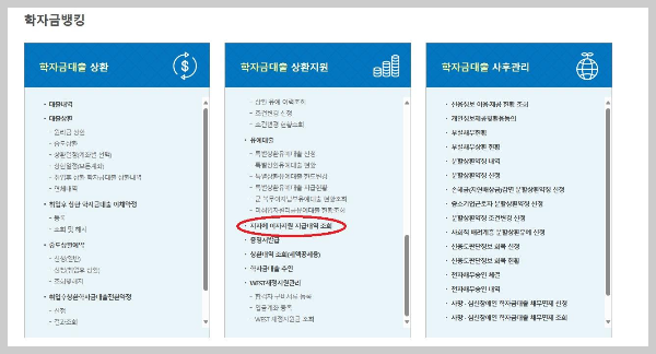 - 한국장학재단 홈페이지(http://www.kosaf.go.kr) → 학자금대출 → 학자금뱅킹 → 학자금대출상환지원 → 지자체 이자지원 지급내역 조회