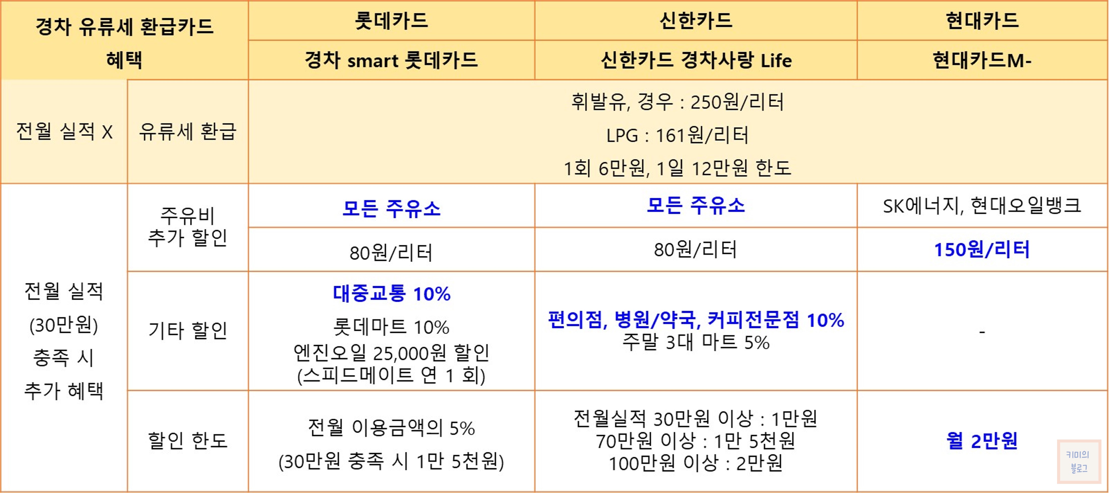 주유비 할인을 중점으로 둔다면 현대카드를, 대중교통도 자주 이용하신다면 롯데카드를, 주유비 할인 외의 다른 할인 혜택을 원하신다면 신한카드 발급을 추천드립니다.