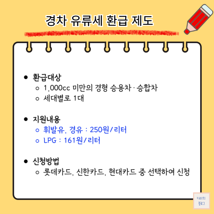 경차 유류세를 환급받을 수 있는 경차 유류세 환급카드의 발급 대상과 혜택, 신청방법에 대해서 정리해 보도록 하겠습니다.