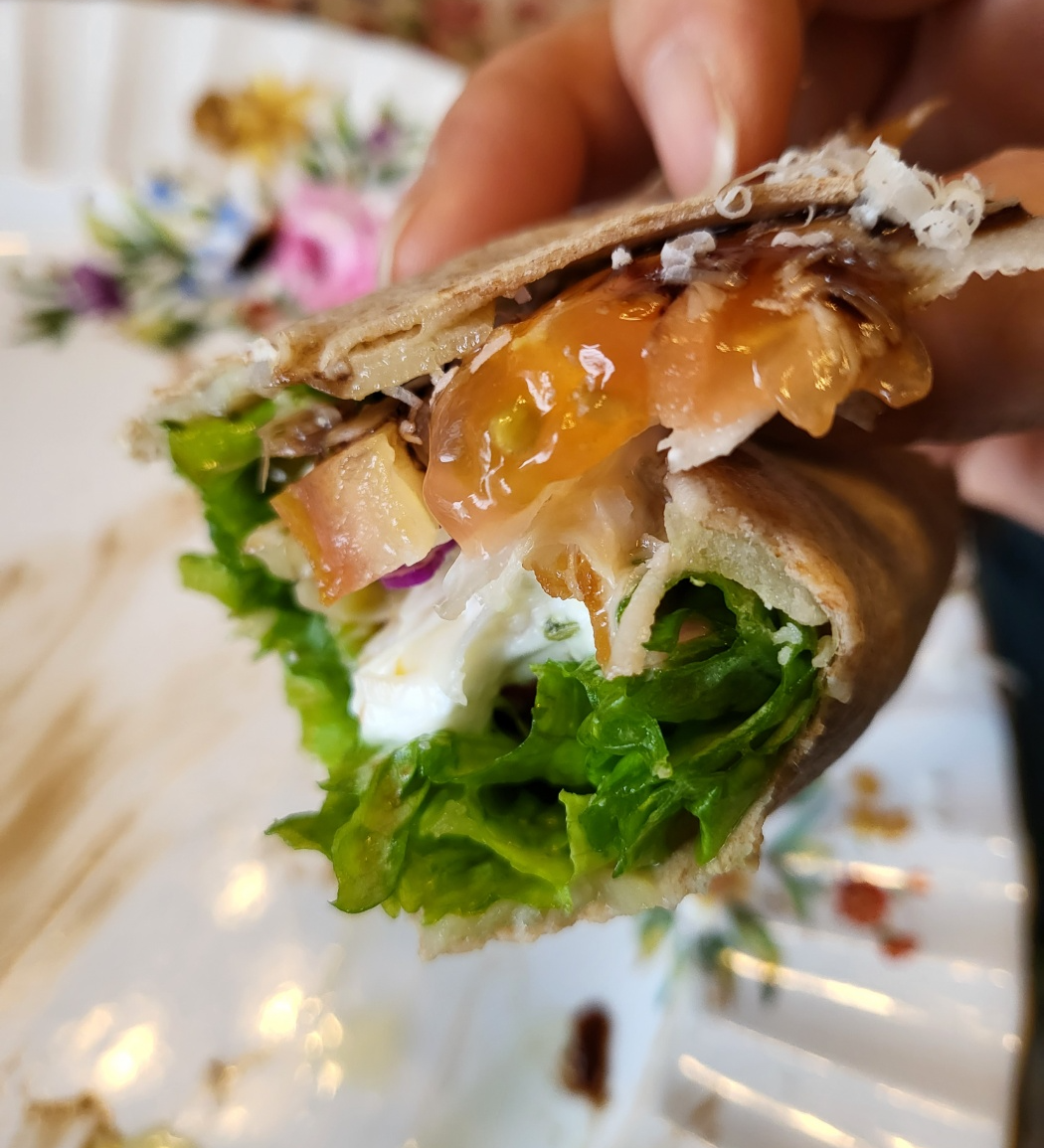 샐러드 피자는 얇은 토르띠야 위에 치즈를 얹고 구운 뒤 샐러드를 올려서 나왔습니다. 처음에는 흔한 샐러드 피자라고 생각했는데, 먹고 나서는 의외로 가장 기억에 남는 음식이었습니다.