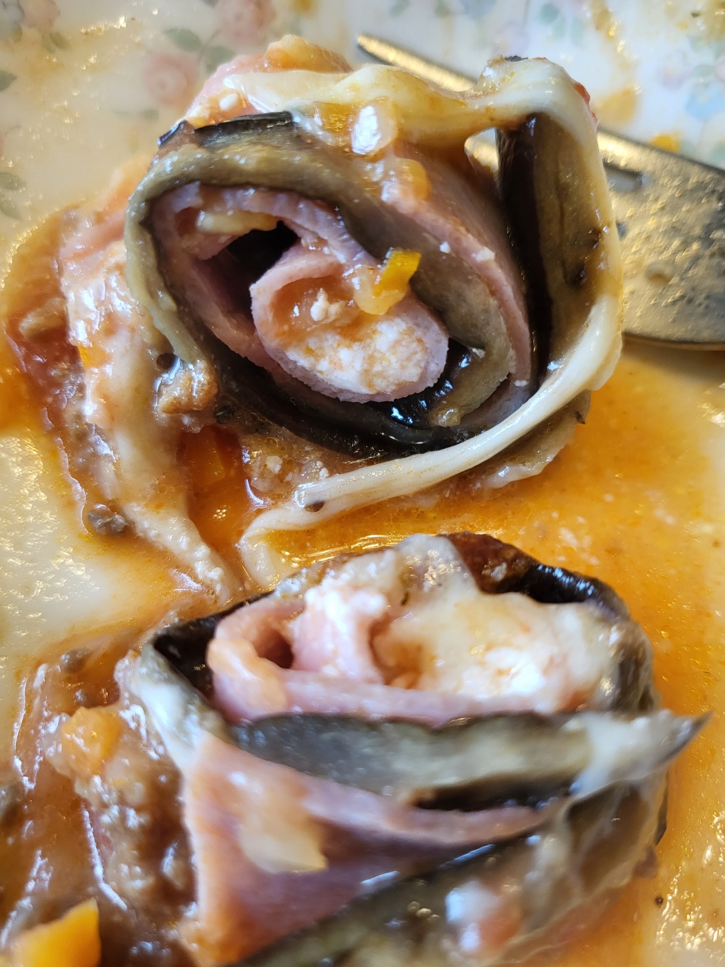 쭈욱 늘어나는 치즈 아래에 가지와 베이컨, 리코타치즈가 돌돌 말려 있습니다. 직접 만든 베이컨의 맛이 포인트가 되고, 구운 가지의 식감과 치즈의 고소함이 정말 맛있었습니다.
