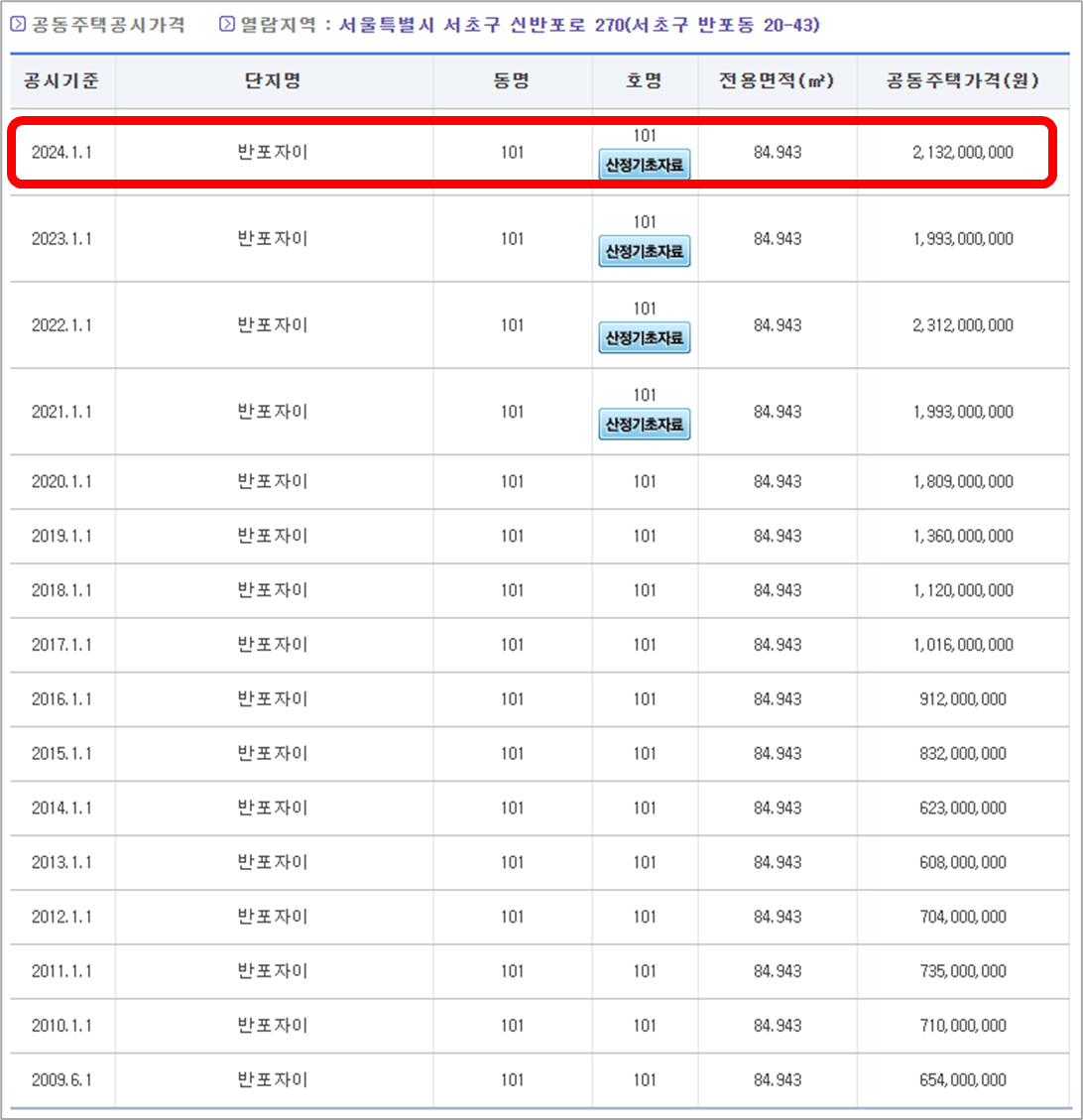 그러면 아래와 같이 최근 몇 년간의 공시지가가 조회됩니다.