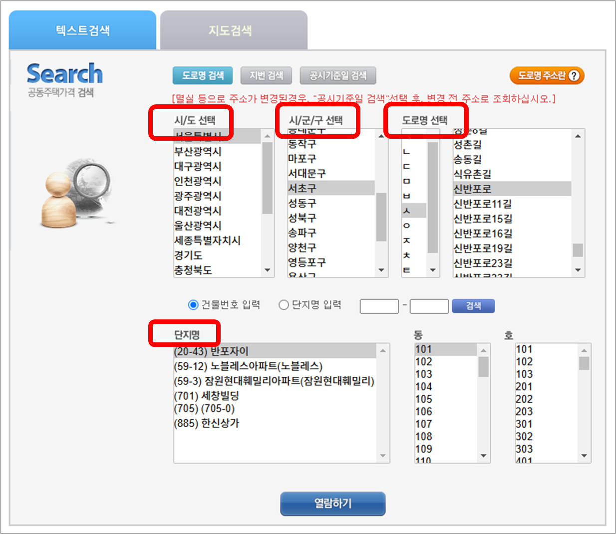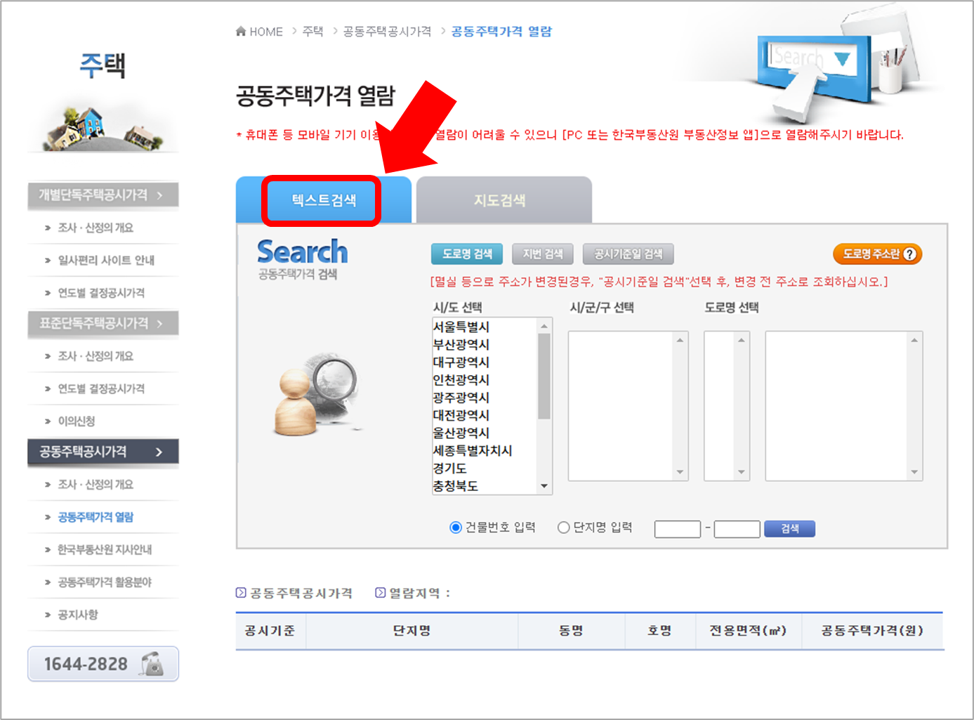 공시지가를 조회할 아파트의 주소가 필요한데, 텍스트 검색과 지도 검색 중 [텍스트 검색]을 추천드립니다.