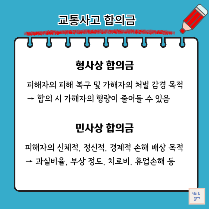 - 민사상 합의금 : 피해자가 입은 신체적, 정신적, 경제적 손해를 배상하기 위한 금액으로, 사고로 인한 손실을 보전하는 목적을 가집니다.