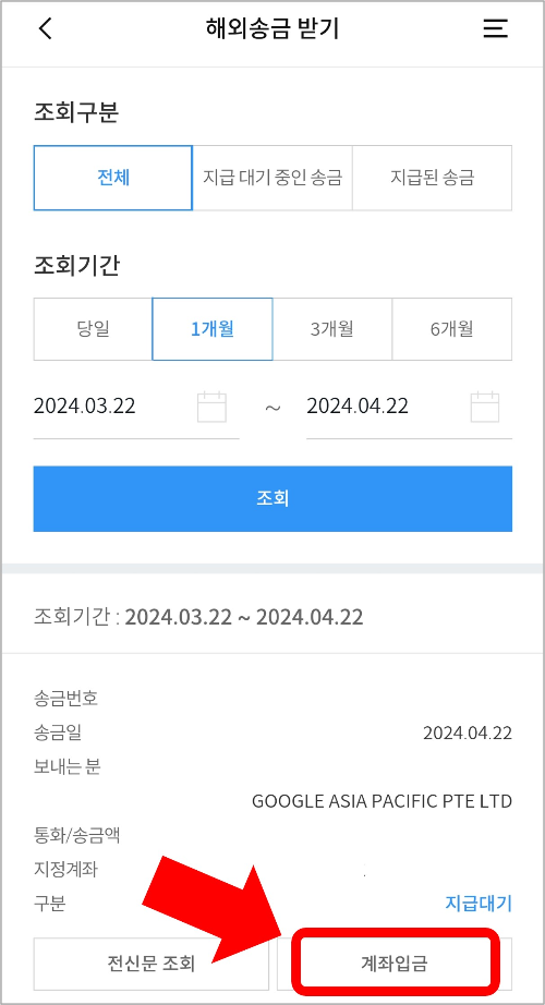 이렇게 조회하면 구글에서 송금된 지급대기 내역을 확인할 수 있습니다. 보내는 분에 구글 어쩌고라고 쓰여 있는 내역에서 계좌입금을 선택합니다.