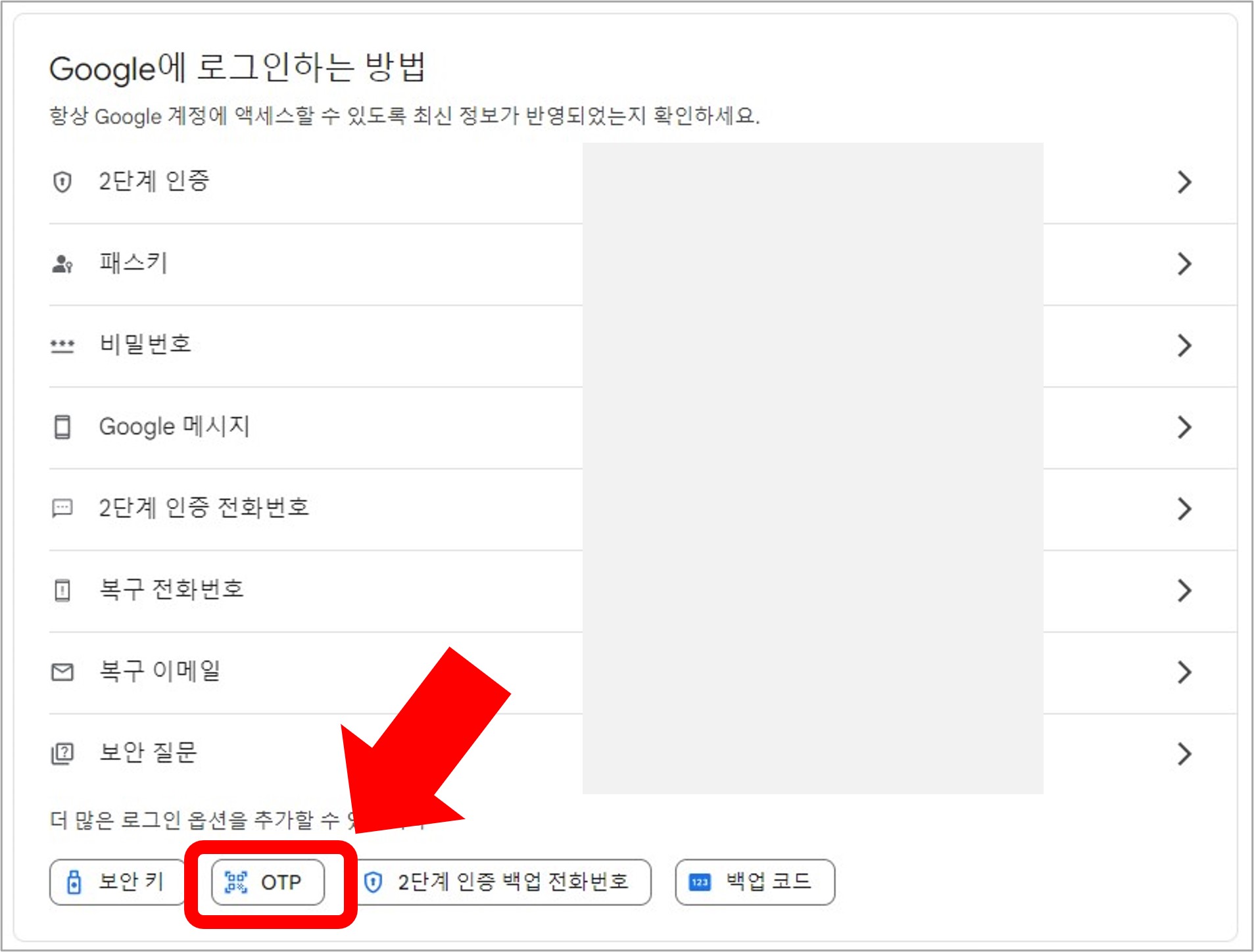 3. PC에서 2단계 인증을 요구하는 로그인 화면에 접속합니다. 구글에서는 계정 설정 > 보안 > 구글에 로그인하는 방법에서 OTP를 선택합니다.