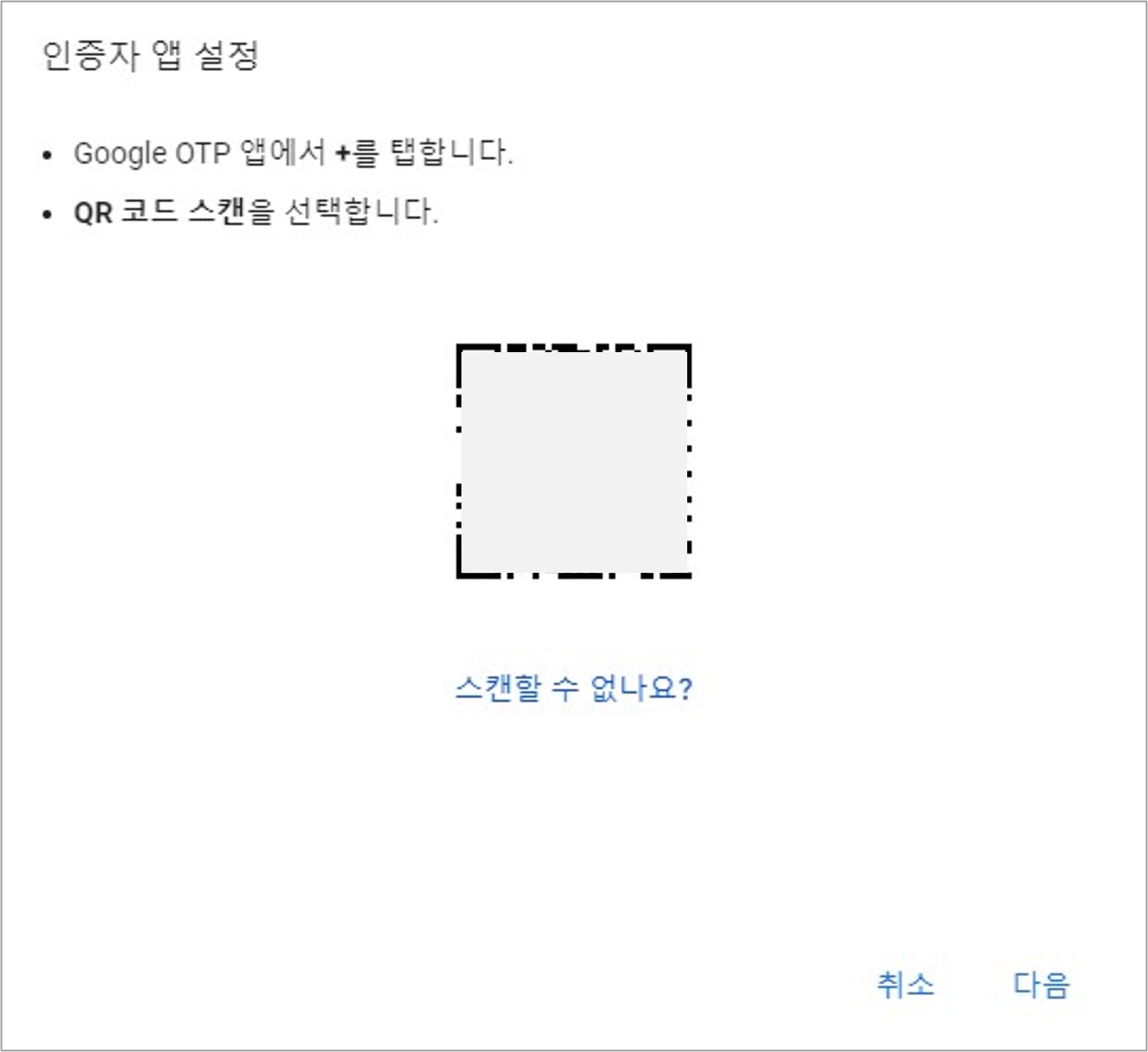 4. 구글 OTP 앱에서 코드 추가 > QR 코드 스캔을 선택하여, PC에 생성된 QR 코드를 스캔합니다.