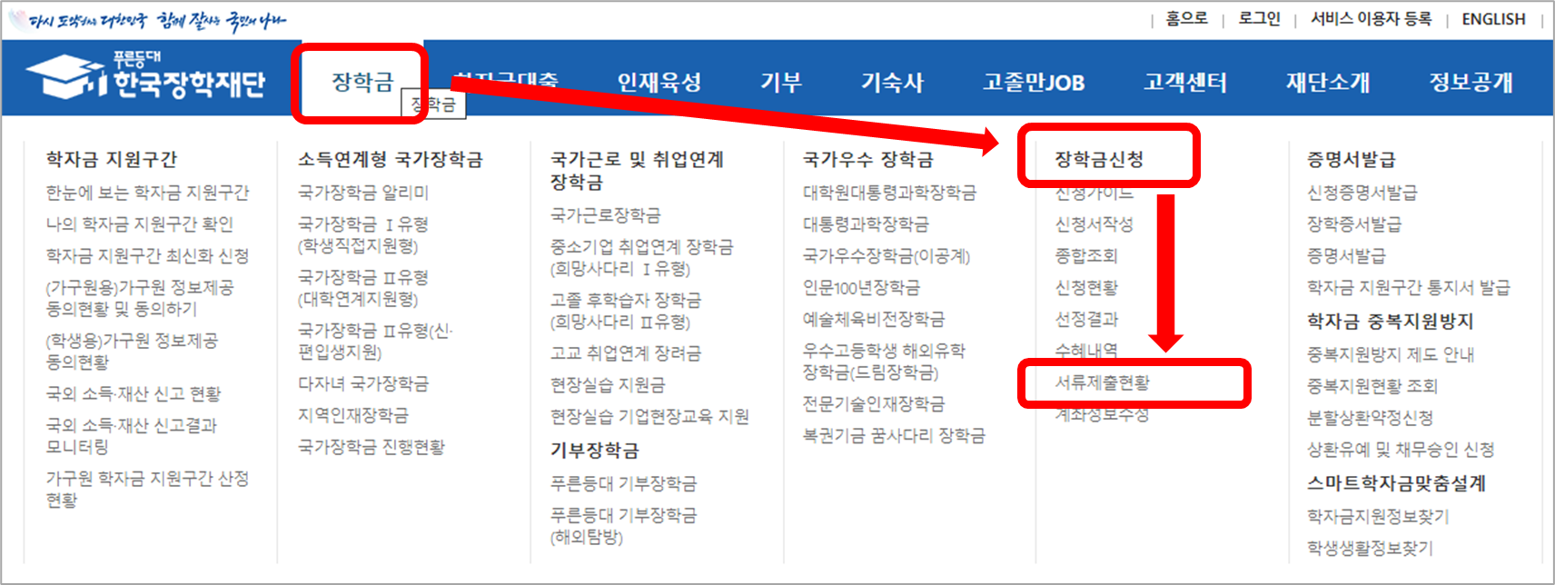 한국장학재단 홈페이지 [장학금 > 장학금신청 > 서류제출현황]에서 제출할 필수서류를 확인할 수 있습니다.