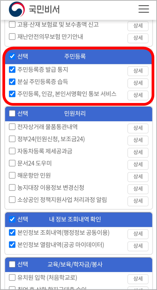 저는 주민등록정보 보호를 위해 주민등록 항목에 있는 세 가지 알림 서비스를 모두 신청했습니다.