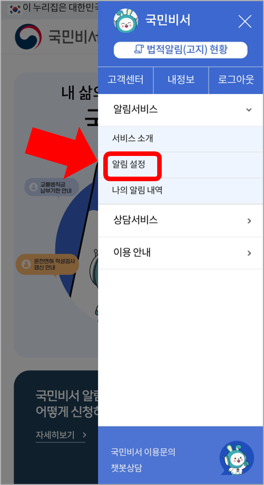 그리고 오른쪽 상단 전체메뉴에서 [알림서비스] → [알림 설정]을 선택합니다.