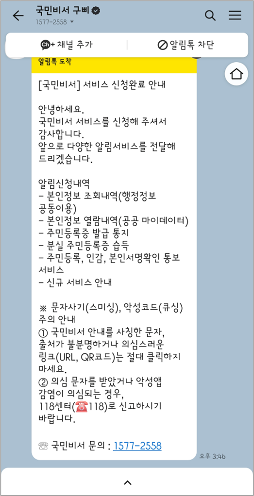 알림 서비스 신청이 완료되면, 선택했던 앱을 통해 아래와 같이 신청완료 안내를 받을 수 있습니다.