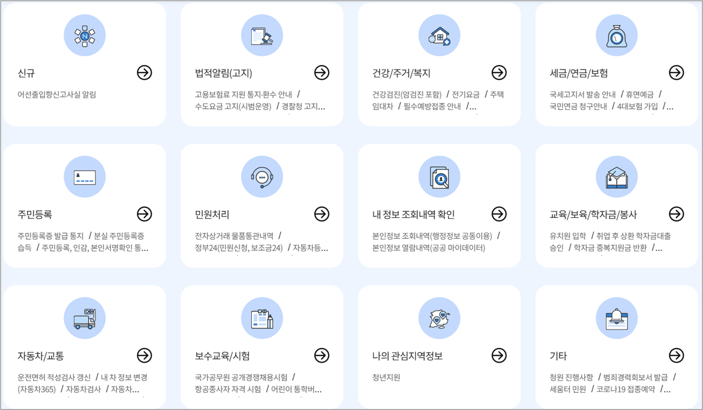 법적 알림, 건강/주거/복지, 세금/연금/보험, 주민등록, 민원처리, 내 정보 조회내역 확인, 교육/보육/학자금/봉사, 자동차/교통, 보수교육/시험, 나의 관심지역정보 등 여러 분야의 중요한 정보와 알림을 받아볼 수 있습니다.