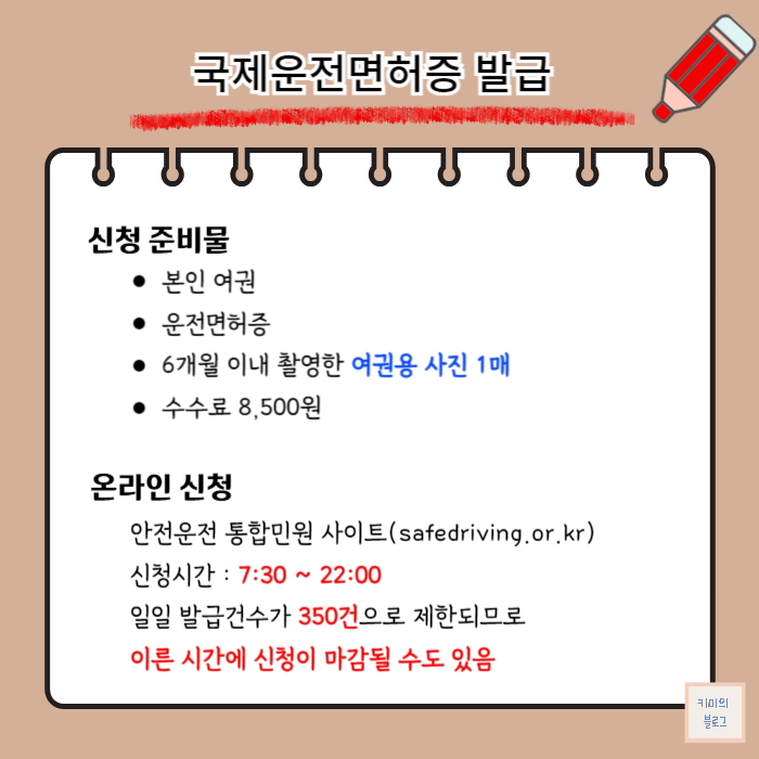 국제운전면허증 온라인 발급 신청은 안전운전 통합민원 사이트에서 할 수 있으며, 7시 30분부터 저녁 10시까지만 가능합니다. 게다가 일일 발급건수가 350건으로 제한되기 때문에 신청자가 많은 날에는 좀 더 이른 시간에 신청이 마감될 수 있습니다.