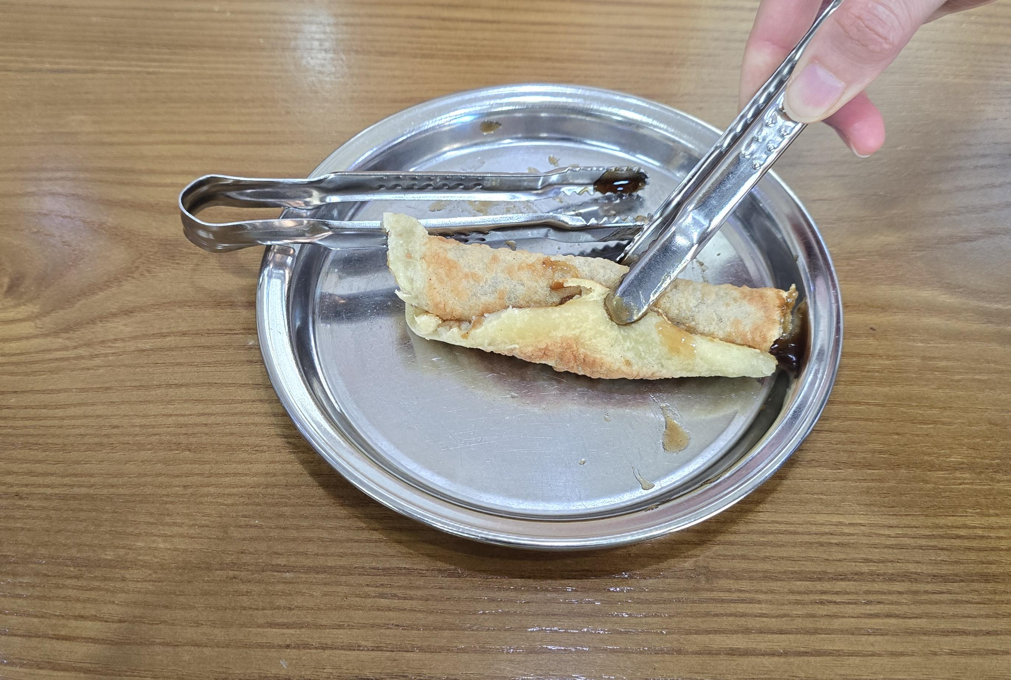 집게로 호떡 윗부분을 뜯어서 안에 고인 꿀을 찍어 먹고 아랫부분만 남으면 돌돌 말아서 먹습니다.
