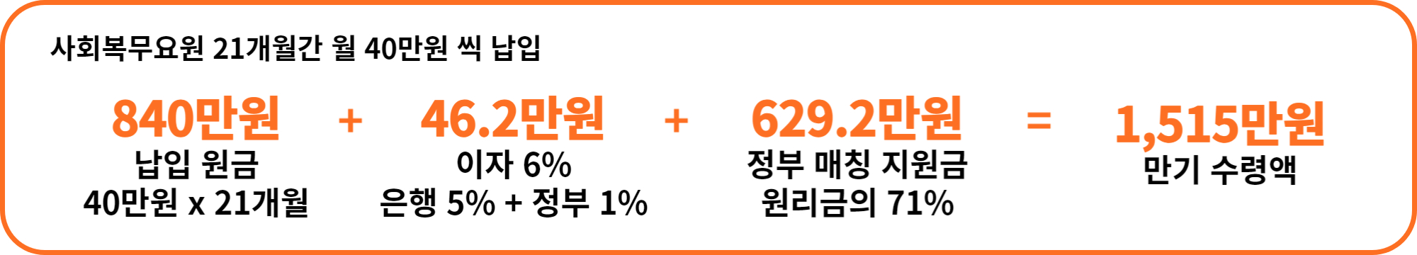 예를 들어, 사회복무요원이 복무기간 21개월 동안 40만원씩 납입하면, 원급 840원에 이자 46만 2천원, 그리고 정부 배칭 지원금 629만 2천원을 더해 만기 시 1,515만원을 수령하게 됩니다.