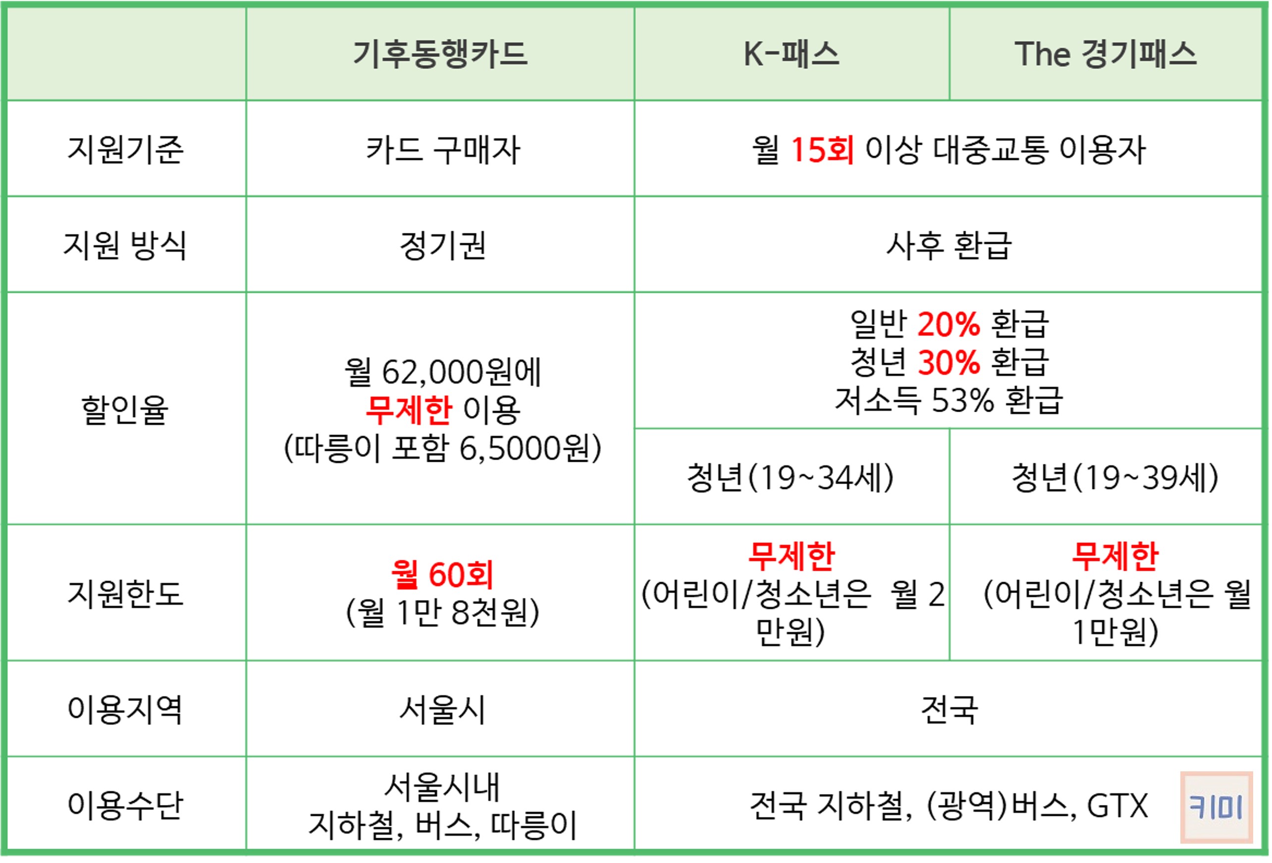 현재 사용되고 있는 알뜰교통카드가 올해 7월에 종료됩니다. 이를 대체하기 위해 K 패스가 새로 도입되는데요. 기후동행카드, K 패스, The 경기카드 등 비슷한 포지션의 대중교통비 지원사업을 비교해 보도록 하겠습니다.