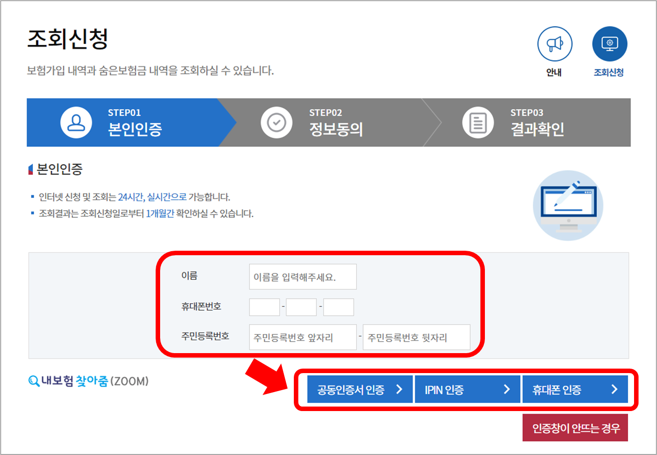 개인정보로 본인 인증을 하면 가입되어 있는 보험 정보와 숨은 보험금을 찾을 수 있습니다.
