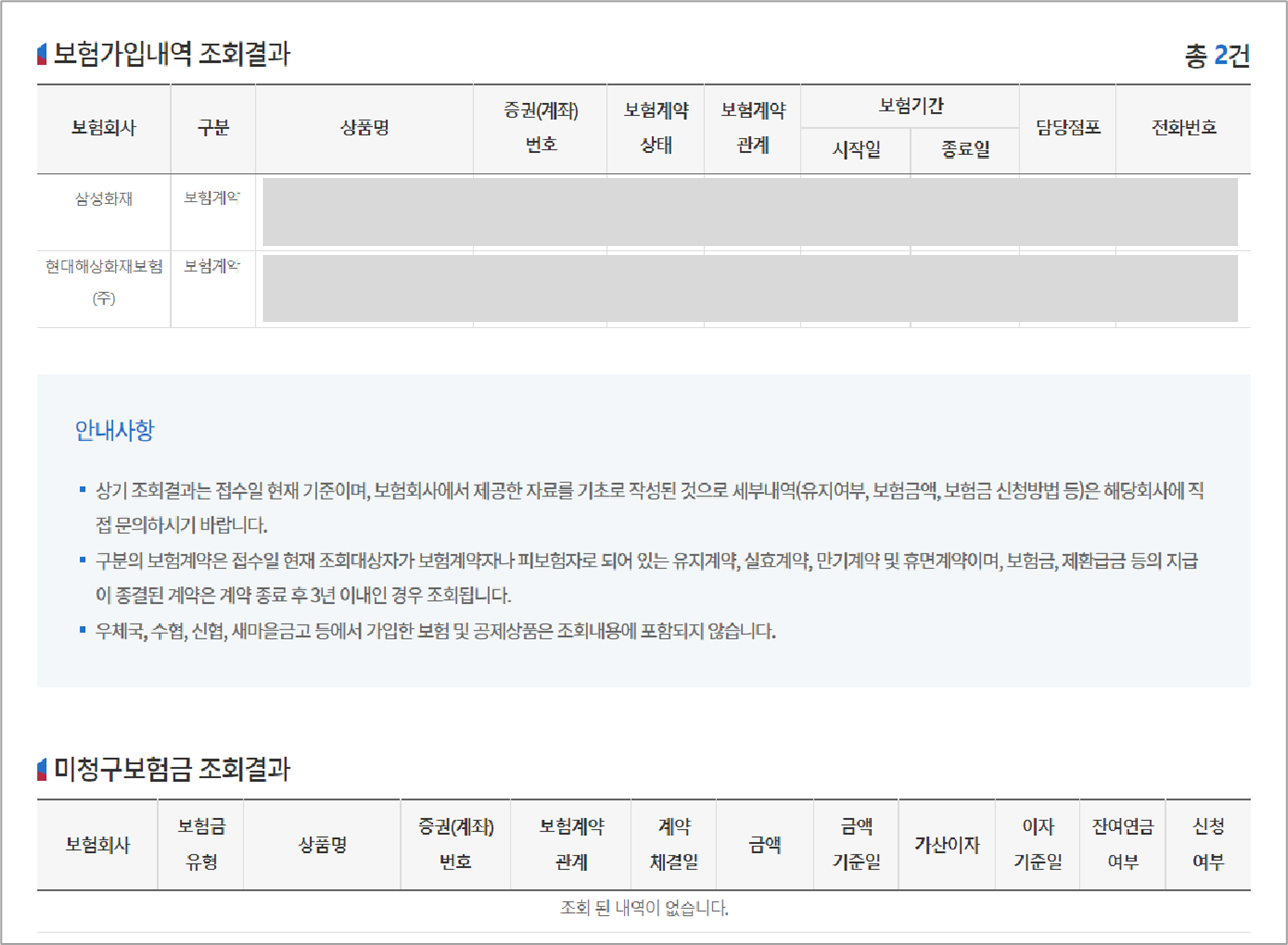 저는 아쉽게도(?) 숨겨진 보험금은 없었지만 현재 가입된 보험 내역을 정확히 확인할 수 있었습니다.