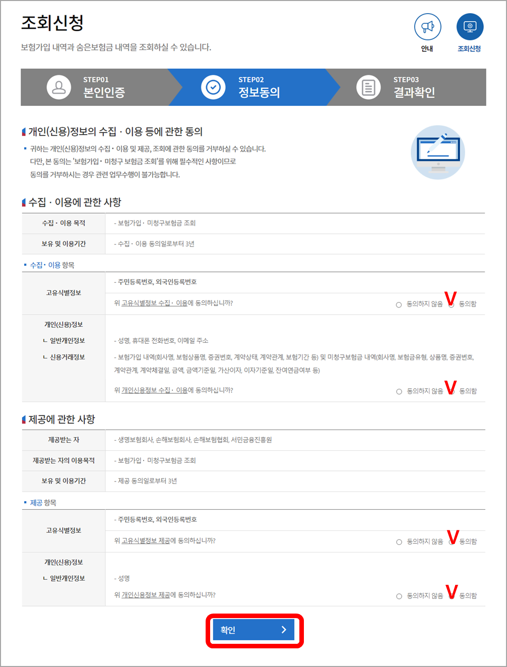 인증 후 개인정보 이용에 동의하고 [확인] 버튼을 선택합니다.