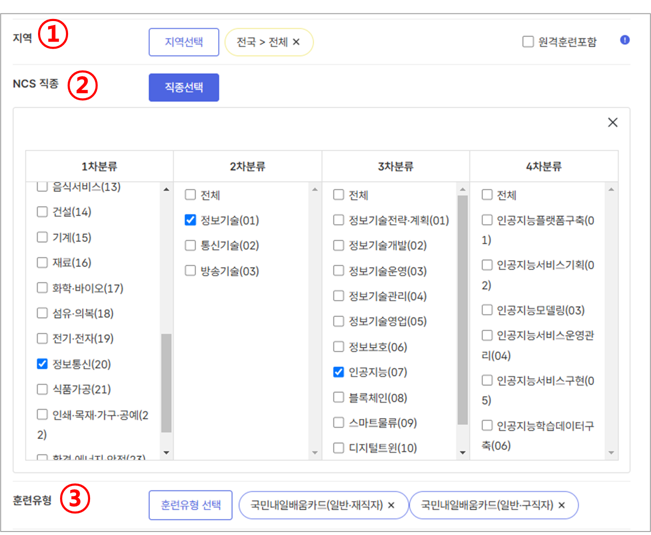 훈련유형은 '국민내일배움카드'를 선택해서 검색하면 내일배움카드 사용이 가능한 교육과정을 확인 가능합니다.