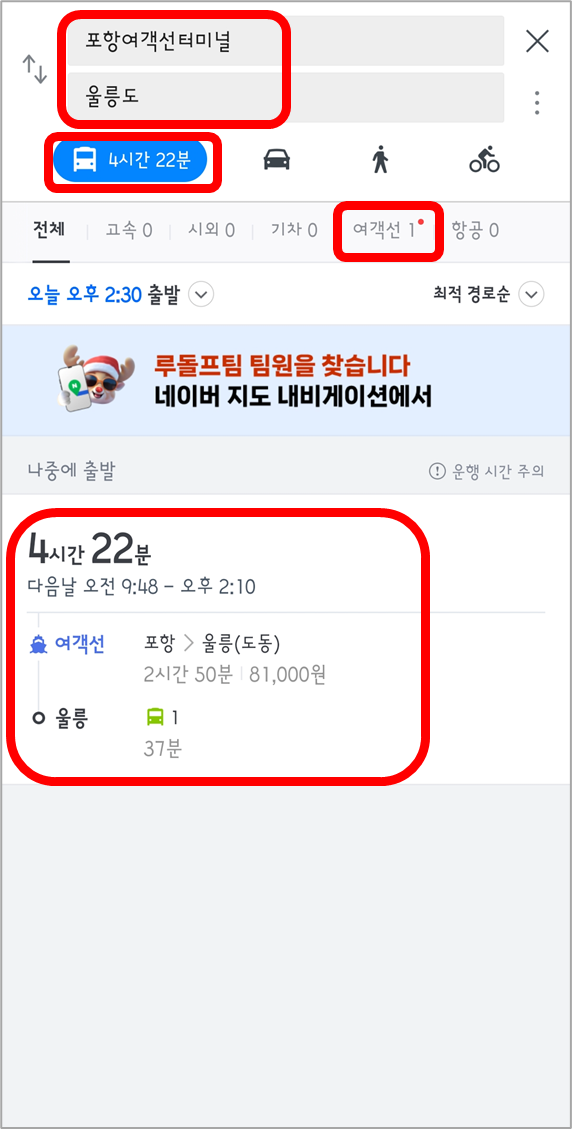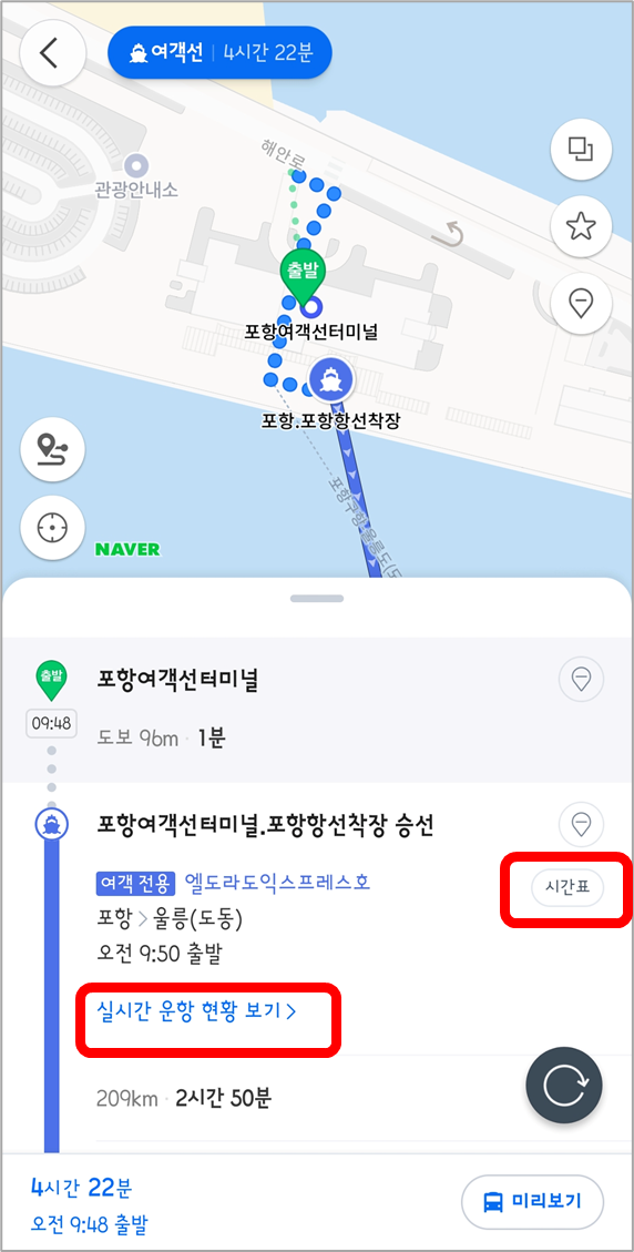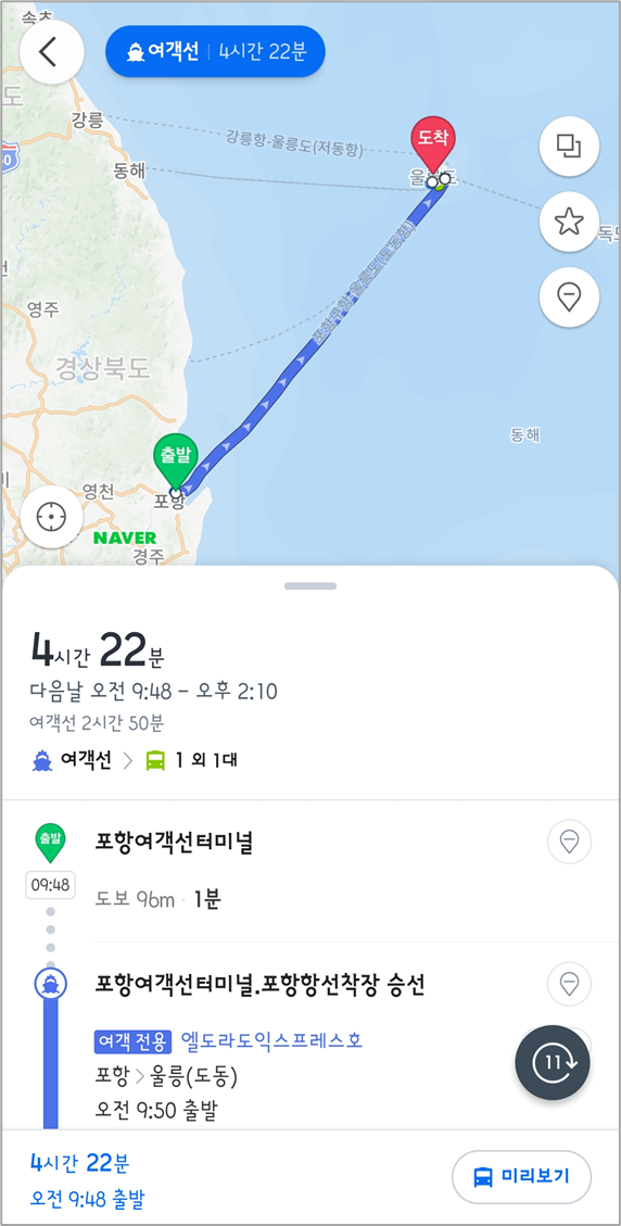 저는 시험 삼아 포항에서 울릉도로 가는 여객선을 검색해 보았는데, 시간표와 요금까지 한 번에 확인할 수 있어서 편리했습니다.