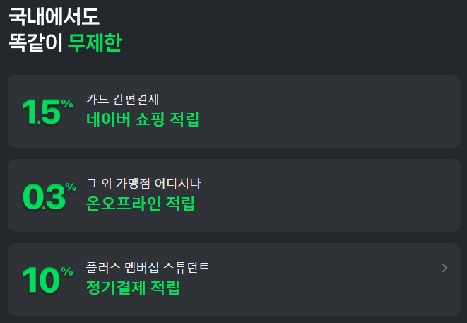 ① 해외결제 3% 적립 + 수수료 무료