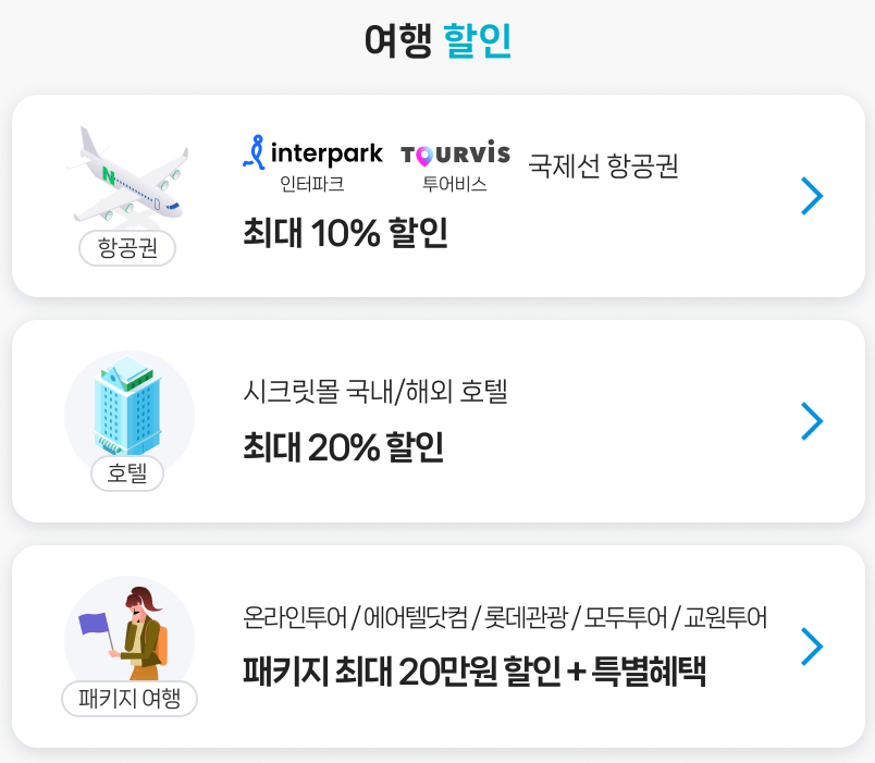 그 외에도 해외유심과 와이파이, 환전, 공항버스, 여행가방, 공항라운지, 면세점, 렌터카, 유럽철도 등의 할인 혜택도 제공됩니다.