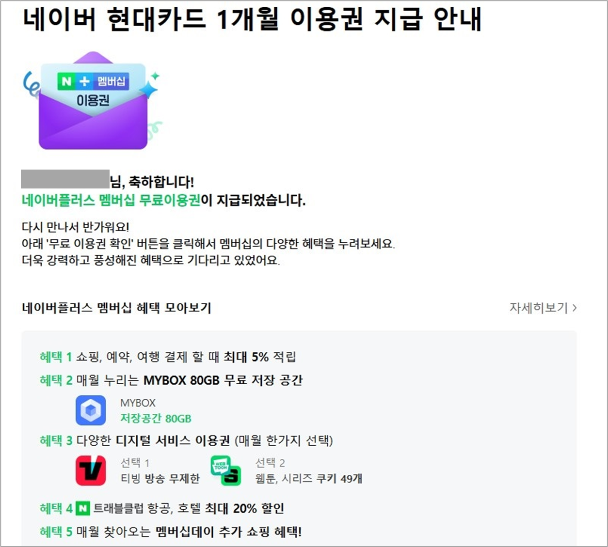 월 4,900원의 네이버플러스 멤버십 이용권이 매달 무료로 제공됩니다.