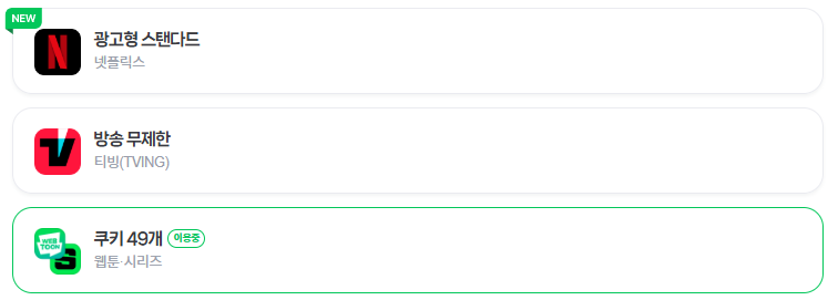 또는 티빙 방송 무제한, 네이버 웹툰·시리즈 쿠키 48개 중에 서비스를 선택할 수 있습니다.